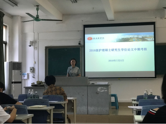 2018年7月5日上午8:30分,国际护理学院在第一教学楼104教室举行2016级研究生中期考核学位论文进展情况汇报会,会议由张彩虹院长主持,王涛副院长、张宏玉教授、海南医学院附属第一医院蒙莉萍主任及海南医学院附属第二医院李珑主任担任本次中期检查考核专家,护理研究生导师及全体研究生参会。