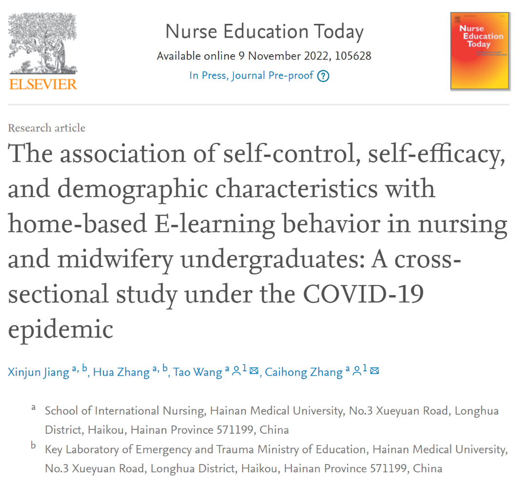 2022年11月09日,海南医学院国际护理学院蒋新军、张华及王涛等老师撰写的学术论文“The Association of Self-Control, Self-Efficacy, and Demographic Characteristics with Home-Based E-Learning Behavior in Nursing and Midwifery Undergraduates: A Cross-Sectional Study under the COVID-19 Epidemic”被国际护理学顶尖杂志《Nurse Education Today》接收并Online,该文第一作者为蒋新军老师,张华教授为第二作者,王涛教授为通讯作者。