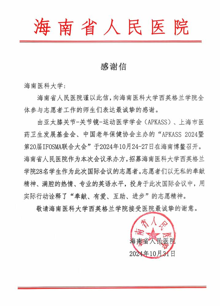 海南省人民医院作为本次会议的承办方,特意向西英格兰学院送来了感谢信,对我院选派的志愿者给予了高度评价。这不仅是对学生个人的肯定,更是对西英格兰学院人才培养模式的认可和赞誉。