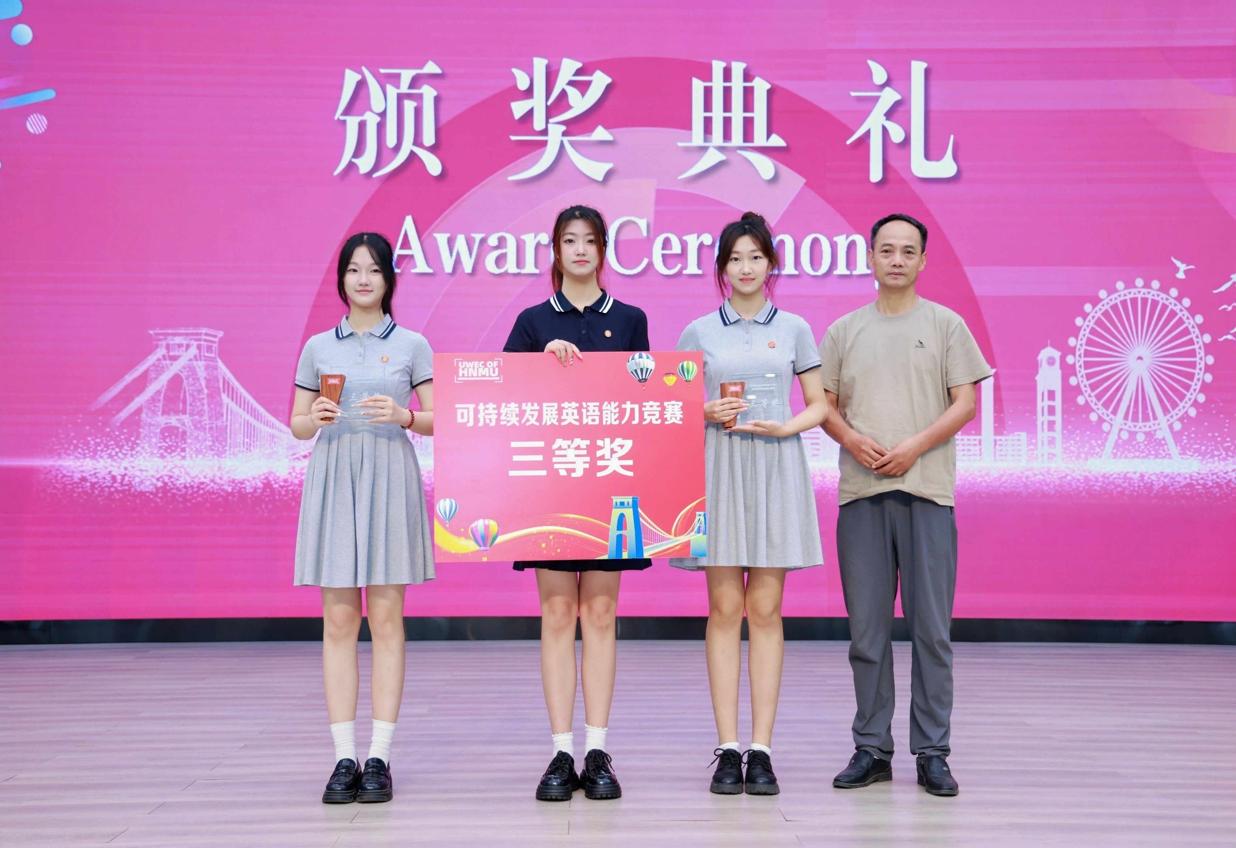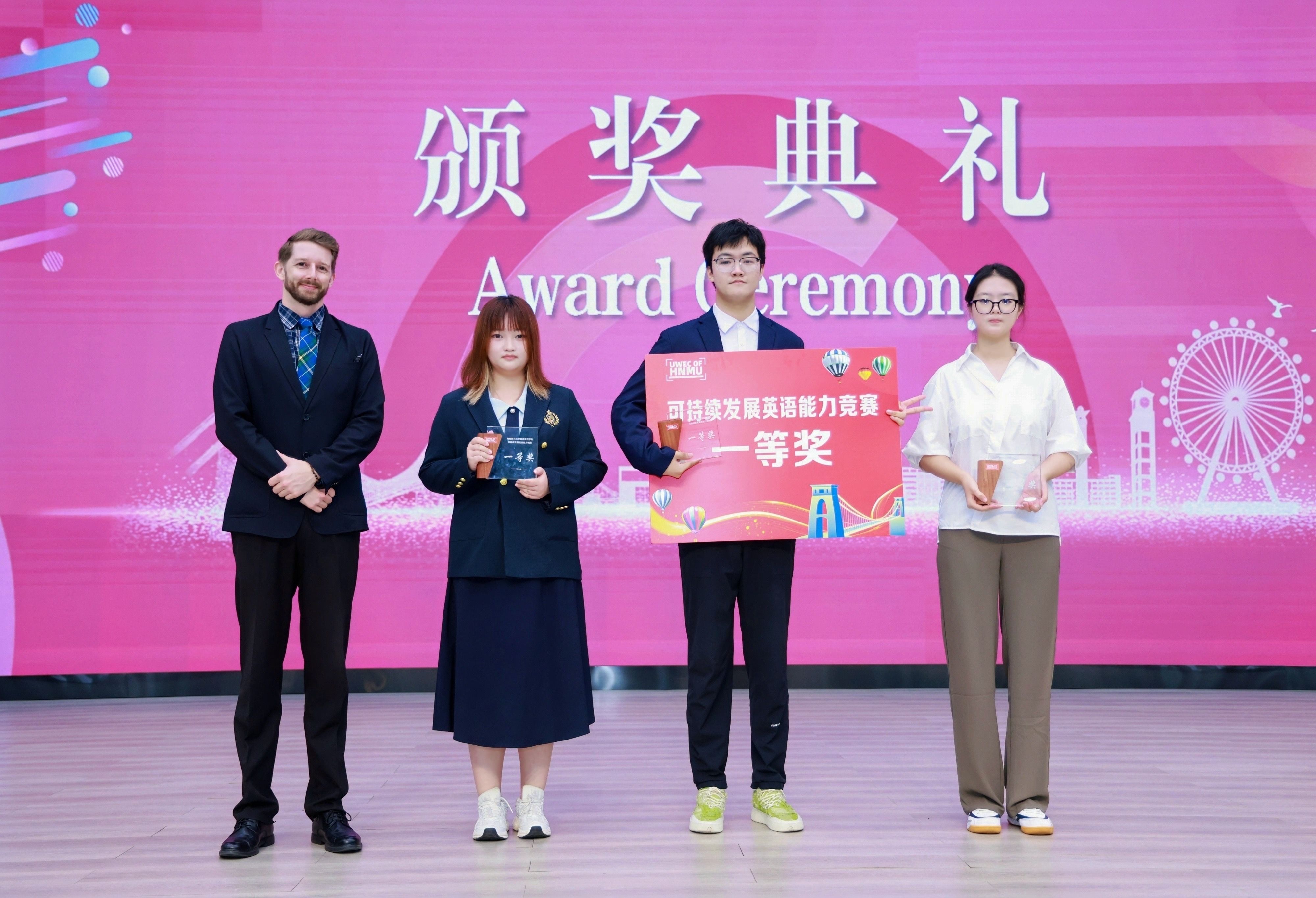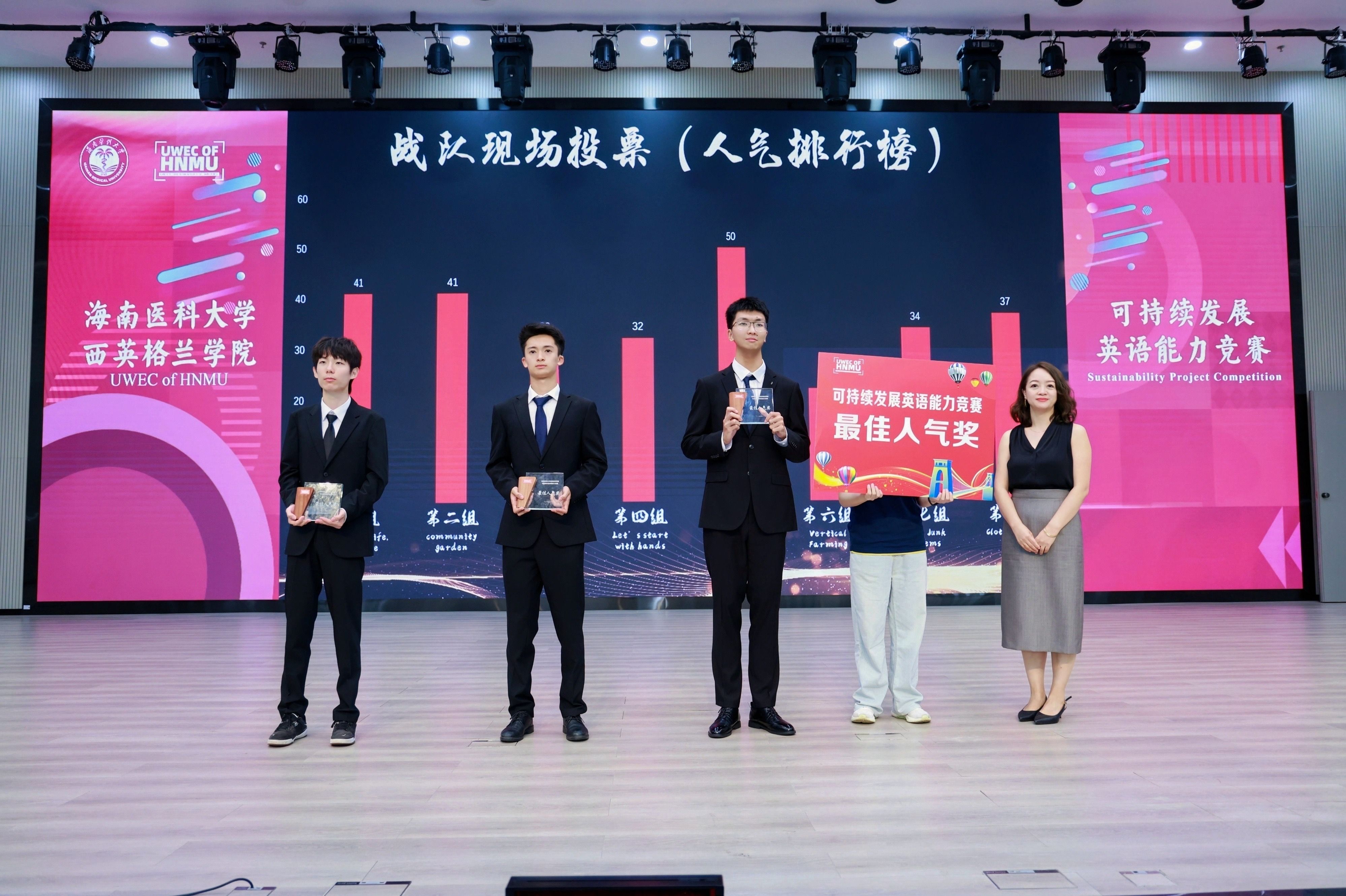 8组选手以流利的英语表达、独到的见解分析、创新的方案呈现,赢得了现场评委与观众的一致好评。这不仅是学生们英语表达能力的精彩展示,更是他们对可持续发展理念深刻理解和实践承诺的生动诠释。最终,比赛评选出一、二、三等奖各1组以及1组“最佳人气奖”。下一步,一等奖获胜组将进入西英格兰大学“可持续发展能力竞赛”亚太赛区,与来自其他国家的优秀学子同台竞技。