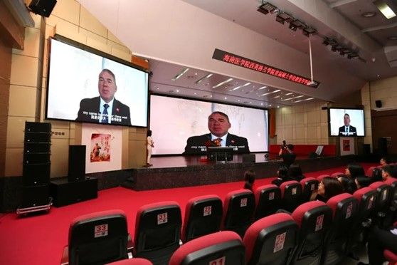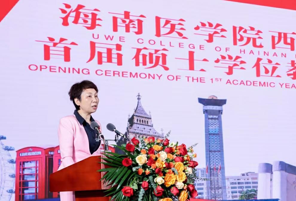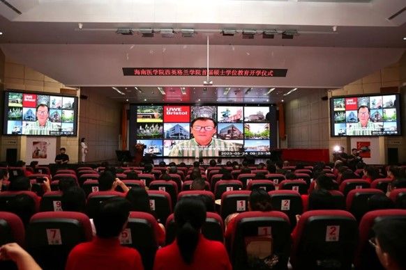 3月27日上午,海南医学院西英格兰学院首届硕士学位教育开学仪式暨学院揭牌仪式在国际报告厅隆重举行。学校党委书记杨俊,英国西英格兰大学中国区总经理 Mr.Frank Yan,学校党委副书记张巍,副校长兼西英格兰学院院长张彩虹,副校长杨伟国,副校长李现红,党委委员、组织部长谢毅强,党委委员、宣传(统战)部长雷浩泽,学校党政职能部门及二级单位的主要负责人,公共卫生、康复治疗、国际护理实践、医学影像技术4个专业的教师代表,以及西英格兰学院全体研究生新生参加仪式。仪式由对外交流与合作处处长、西英格兰学院党委书记李果果主持。