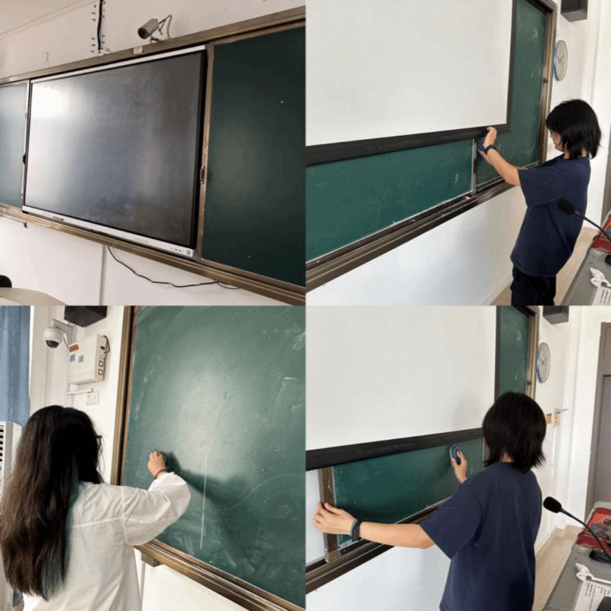 3月24日,同学们在智慧教育大楼的教室开展了黑板清洁活动。活动开始前,同学们向雷锋同志致敬并号召大家行动起来。同学们用心擦拭黑板,认真清除污渍,确保每块黑板都焕然一新。