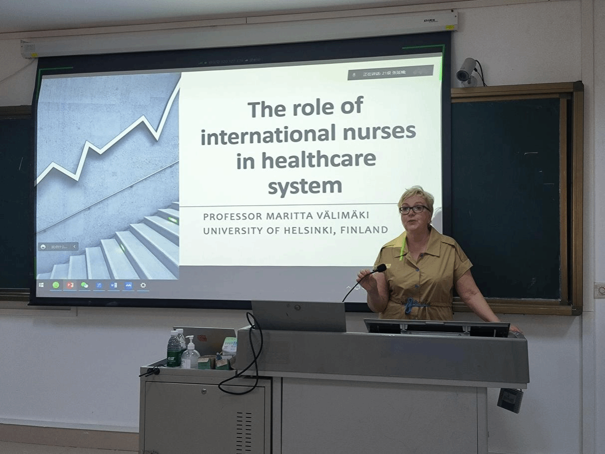 6月4日上午,国际护理学院和西英格兰学院联合举办的教育部沿海区域护理学专业虚拟教研室线下活动顺利举行。本次活动邀请了美国护理科学院院士、芬兰赫尔辛基大学护理学院院长Maritta Anneli Välimäki教授在海南医学院研究生楼803教室举行题为“The Role of International Nurses in the Healthcare System”的讲座。讲座采用线上+线下的形式进行。国际护理学院副院长郭洪花、西英格兰学院党委副书记徐芳芳、西英格兰大学国际事务部高级经理梅龙,部分教师代表及西英格兰学院护理专业本科生和研究生参加了讲座。讲座由西英格兰学院国际事务中心赵莲芬老师主持。