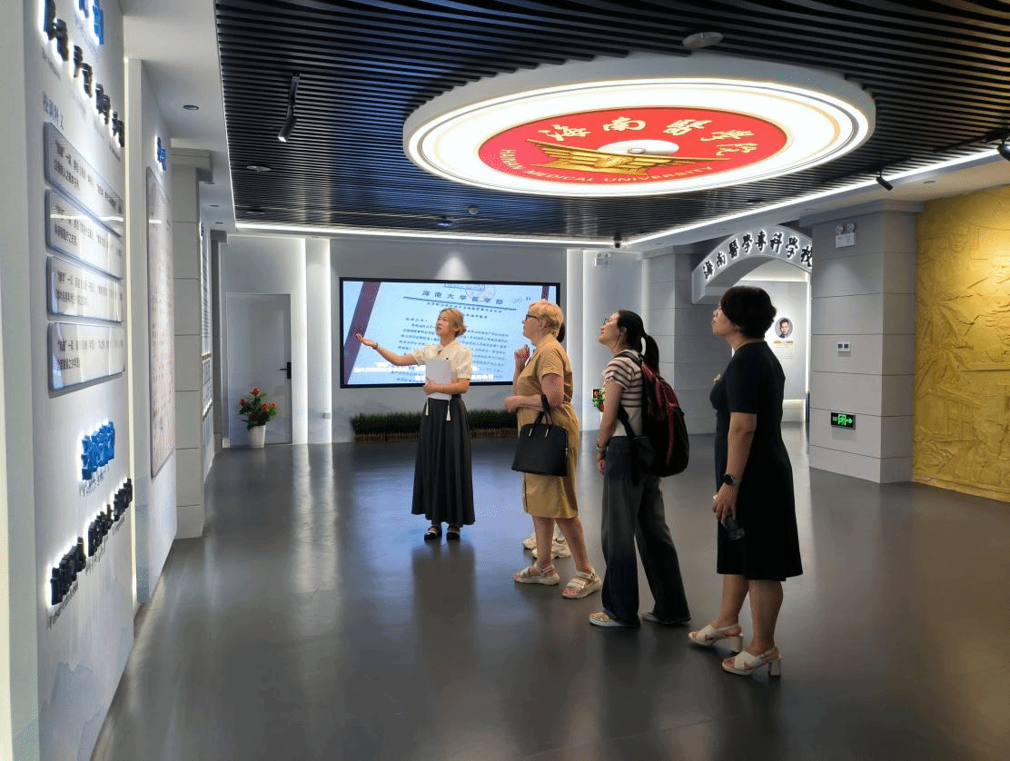 讲座结束后,Maritta教授在国际护理学院副院长郭洪花,老师及学生代表的陪同下,一同前往海南医学院校史馆参观西英格兰学院护理2023级本科专业学生戚饶婷作为此次的解说员。她用流利的英文,从taptap点点70余年的办学历史、奋斗历程、发展成就以及未来展望等几个角度为来宾做了详细讲解