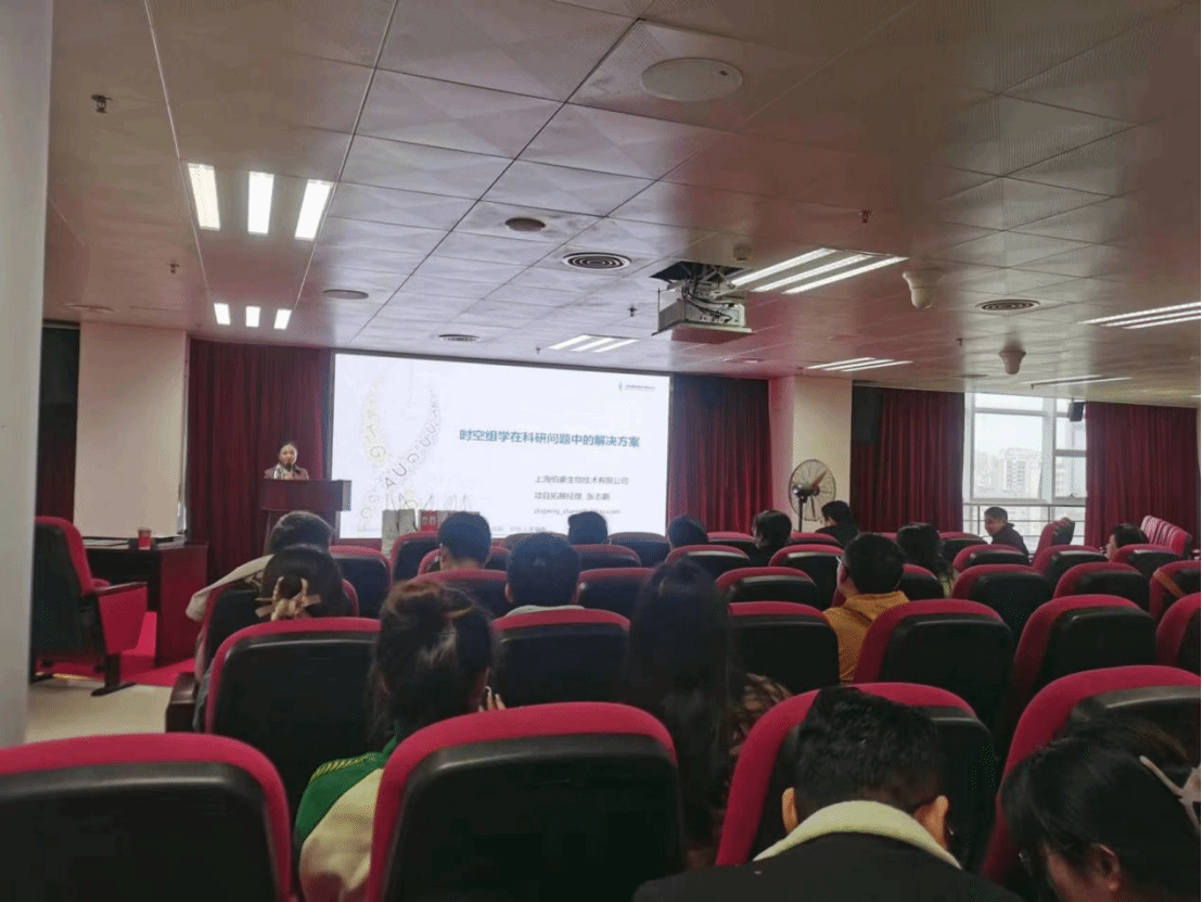 2023年12月21日,在图书馆7楼学术报告厅进行了《时空组学在科研问题中的应用方案》的学术讲座,会议由海南省肿瘤发生与干预重点实验室副主任朱明月主持,伯豪生物项目拓展经理张志鹏博士进行汇报,老师和学生们积极参与。在报告中,张志鹏博士着重讲解了单细胞测序、Visium空间转录组测序和Xenium原位杂交技术的原理及应用并介绍了三种技术的优势互补,以及在发表文章时如何分析挖掘数据。此外,张博士还介绍了基于CRISPR的分子诊断技术原理及应用和Olink技术在生物标志物开发中的应用。会后在座的老师和学生积极同张志鹏博士进行了交流,现场学术气氛热烈。