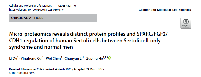 我院何祖平研究团队最新研究发现,唯支持细胞综合征与正常人类睾丸支持细胞具有不同的蛋白表达谱,并且SPARC/FGF2/CDH1调控通路在人类支持细胞中发挥重要作用。相关成果以“Micro-proteomics reveals distinct protein profiles and SPARC/FGF2/CDH1 regulation of human Sertoli cells between Sertoli cell-only syndrome and normal men”为题发表在《Cellular and Molecular Life Sciences》上。