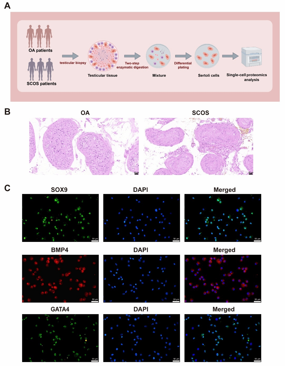 由于获取足量人类睾丸组织困难,传统蛋白质组学难以比较SCOS患者与正常男性支持细胞的大规模蛋白质表达谱。为解决这一难题,我们采用仅需1-100个细胞的微量蛋白质组学技术,揭示SCOS患者与梗阻性无精子症(OA)患者(具有正常生精功能)之间支持细胞的蛋白质组差异。在收集SCOS与OA睾丸组织后,我们使用两步酶消化法结合差异贴壁提取支持细胞,并对提取的支持细胞进行鉴定,随后进行微量蛋白质组学(图1)。