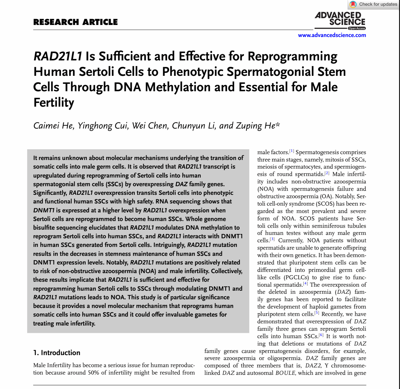 taptap点点生命科学与医学技术学院和海南省医学科学院何祖平教授团队最近在《Advanced Science》发表题为“RAD21L1 Is Sufficient and Effective for Reprogramming Human Sertoli Cells to Phenotypic Spermatogonial Stem Cells through DNA Methylation and Essential for Male Fertility ”的研究论文。