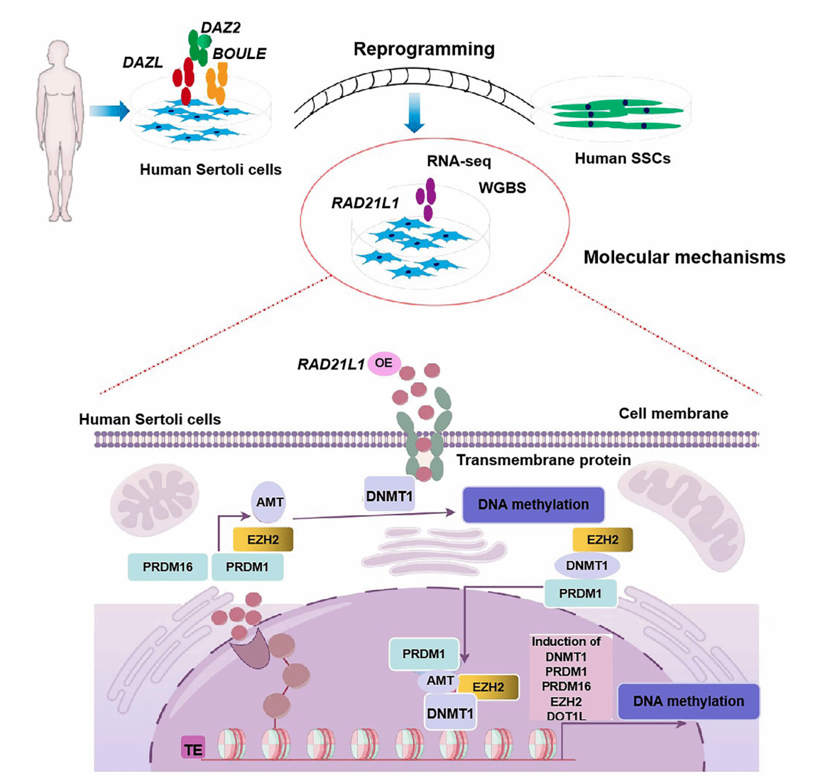 本研究发现,在将支持细胞重编程为人类精原干细胞的过程中,过表达DAZ家族基因可显著上调RAD21L1基因表达水平。RAD21L1过表达能促使支持细胞重编程成为具有生化表型特征和功能特性的高安全性人类精原干细胞。全基因组亚硫酸氢盐测序结果表明,RAD21L1通过调控DNA甲基化参与支持细胞重编程为精原干细胞的过程,且RAD21L1与支持细胞重编程成为的精原干细胞DNMT1存在相互作用。此外,RAD21L1突变会导致人类精原干细胞干性维持以及DNMT1表达水平下降。全外显子测序(WES)显示,RAD21L1 突变与非梗阻性无精子症(NOA)及男性不育风险呈正相关。该研究提供了一种全新的将人类体细胞重编程为人类精原干细胞的分子机制,为治疗男性不育提供宝贵的生殖细胞。
