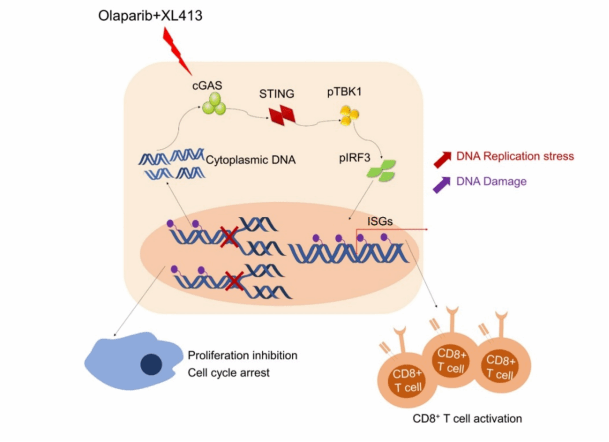 今日我院谭静教授团队在《Advanced Science》杂志上发表了题为“CDC7 Inhibition Potentiates Antitumor Efficacy of PARP Inhibitor in Advanced Ovarian Cancer”的研究论文。该研究通过对卵巢癌公共数据库进行生物信息学分析发现卵巢癌对PARP抑制剂耐药可能与异常的细胞周期相关通路有关,使用细胞周期小分子药物库筛选发现CDC7抑制剂可协同增强PARP抑制剂的抗肿瘤疗效,转录组学测序发现两药联合显著富集免疫相关通路,两药联合通过诱导DNA损伤DNA复制压力增加,激活cGAS/STING信号通路,上调免疫相关基因的表达增强肿瘤抗原呈递,促进CD8+ T细胞的激活和杀伤能力。本研究为PARP抑制剂耐药的卵巢癌患者提供有效的治疗策略,扩大了PARP抑制剂的临床应用,有效提高患者生存率。