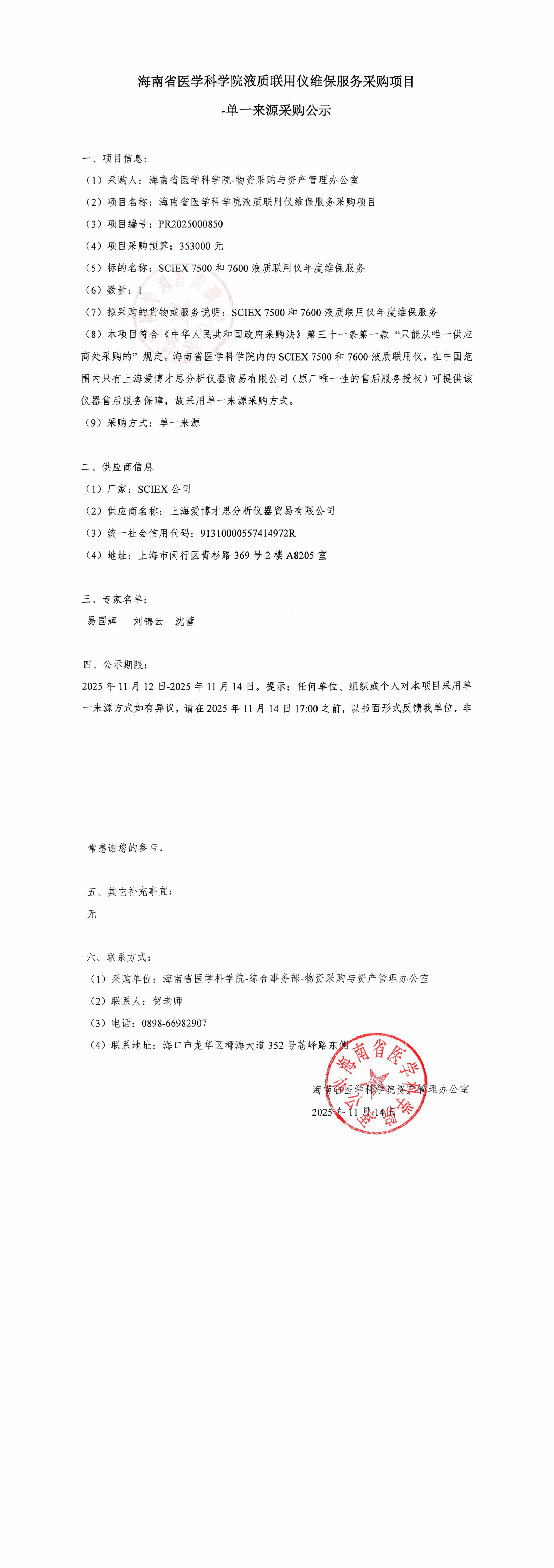 (8)本项目符合《中华人民共和国政府采购法》第三十一条第一款 “只能从唯一供应商处采购的” 规定。海南省医学科学院内的SCIEX 7500和7600液质联用仪,在中国范围内只有上海爱博才思分析仪器贸易有限公司(原厂唯一性的售后服务授权)可提供该仪器售后服务保障,故采用单一来源采购方式。
