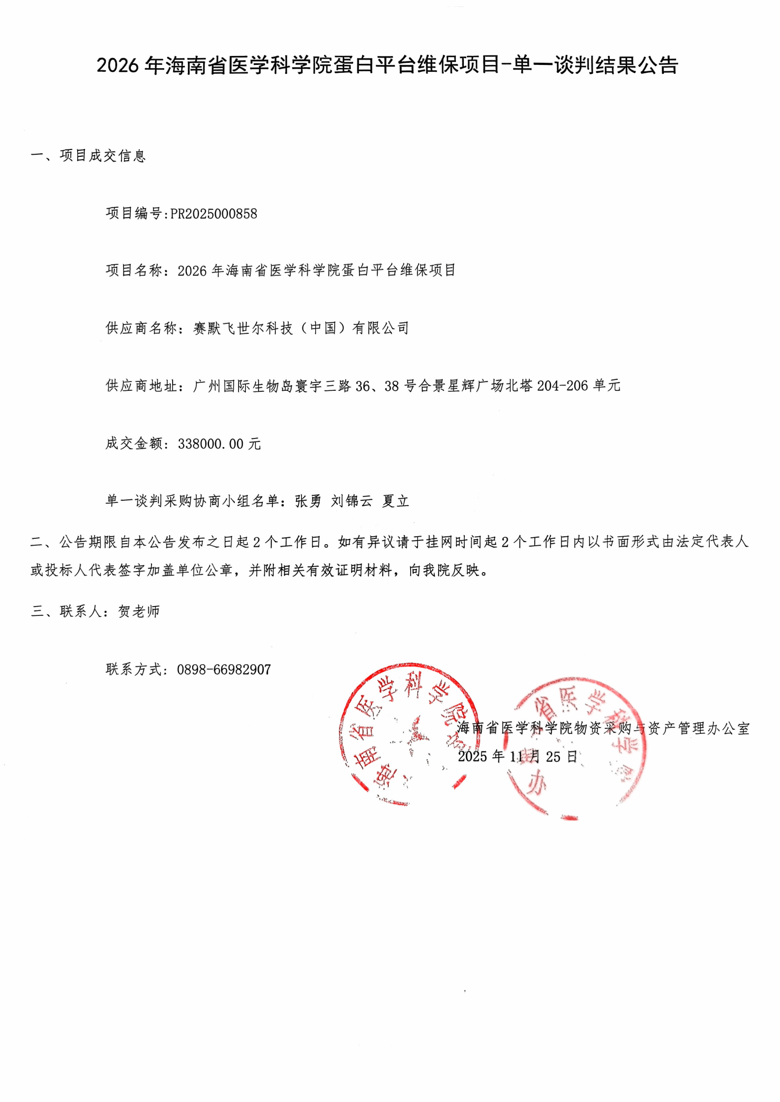 项目名称:2026年海南省医学科学院蛋白平台维保项目