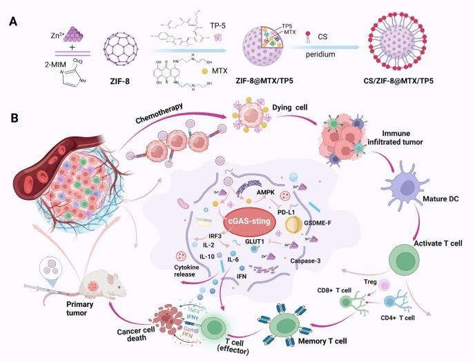 该研究设计了一种pH敏感的ZIF-8沸石咪唑酯框架纳米制剂(CS/NPs),通过封装化疗药物米托蒽醌(MTX)和胸腺五肽(TP5),并结合肿瘤靶向的硫酸软骨素(CS),实现了高效的cGAS-STING通路激活和免疫检查点阻断。CS/NPs不仅赋予了纳米框架特定的肿瘤靶向活性,还显著降低了系统毒性。此外,协调的Zn2+能够破坏癌细胞糖酵解过程,下调葡萄糖转运蛋白1(GLUT1)的表达,从而剥夺癌细胞的能量来源。Zn2+还启动了AMPK通路,导致PD-L1蛋白降解,增强了CRC细胞对免疫治疗的敏感性。同时,MTX治疗过程中产生的双联DNA损伤激活了cGAS-STING通路,与TP5共同作用,促进了T淋巴细胞和树突状细胞的增殖与分化,进一步增强抗CRC免疫效应。