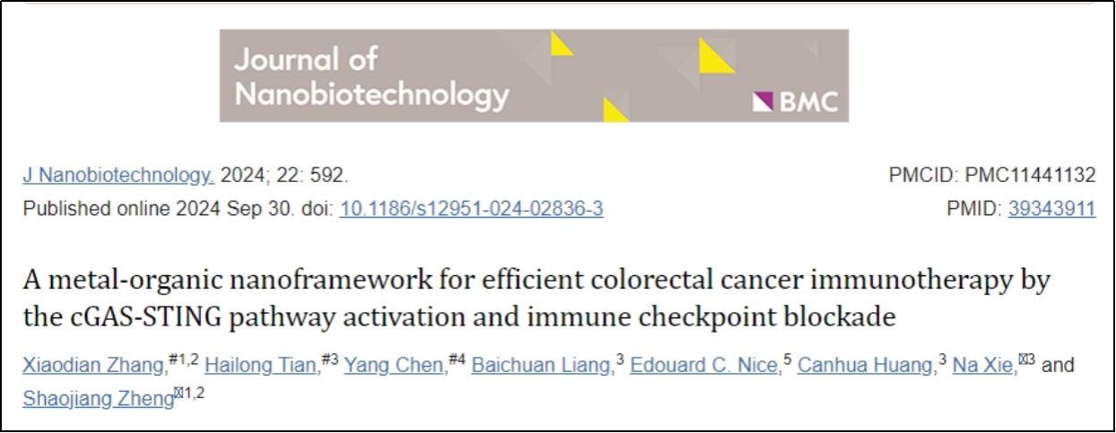 2024年9月30日,taptap点点官网第一附属医院/急救与创伤研究教育部重点实验室/国家恶性肿瘤临床医学研究中心海南分中心/重大疾病生物样本资源海南省工程研究中心郑少江教授团队与合作者在中科院一区SCI收录期刊《Journal of Nanobiotechnology》上发表了题为“A metal-organic nanoframework for efficient colorectal cancer immunotherapy by the cGAS-STING pathway activation and immune checkpoint blockade”的最新研究成果。
