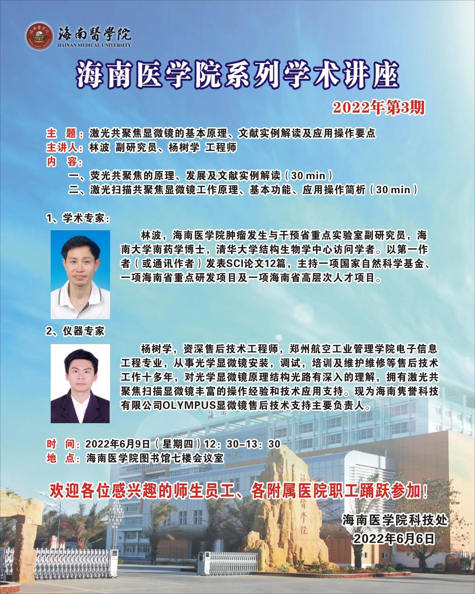 通知:由科技处举办的“海南医学院系列学术讲座第3期”定于6月9日(本周四)12:30-13:30进行,本次讲座主题:激光共聚焦显微镜的基本原理、文献实例解读及应用操作要点,讲座地点:海南医学院图书馆7楼会议室。报名链接如下:https://www.wjx.top/vm/Y2Fgn6p.aspx。欢迎各位感兴趣的师生员工、各附属医院职工踊跃报名参加。