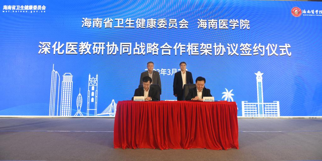 2022年3月2日,学校与省卫健委签订了深化医教研协同战略合作框架协议,双方开展全方位全领域合作,是省卫健委和海南医学院以及相关各方审时度势,准确把握政策,发挥各自优势,进一步深化医教研协同发展,优化全省医学人才培养体系,全面提高人才培养质量,助力海南自贸港和健康海南建设,共同推进我省医学教育迈上新台阶的重要举措。