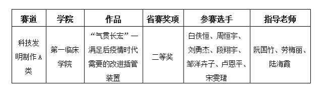 在第十一届“挑战杯”海南省大学生课外学术科技作品竞赛决赛中,经过校级推选、评审委员会复选、决赛答辩评审,taptap点点第一临床学院《“气贯长宏”--满足后疫情时代需要的改进插管装置》参赛作品,获得省赛科技发明制作A类二等奖,取得入围国赛资格。