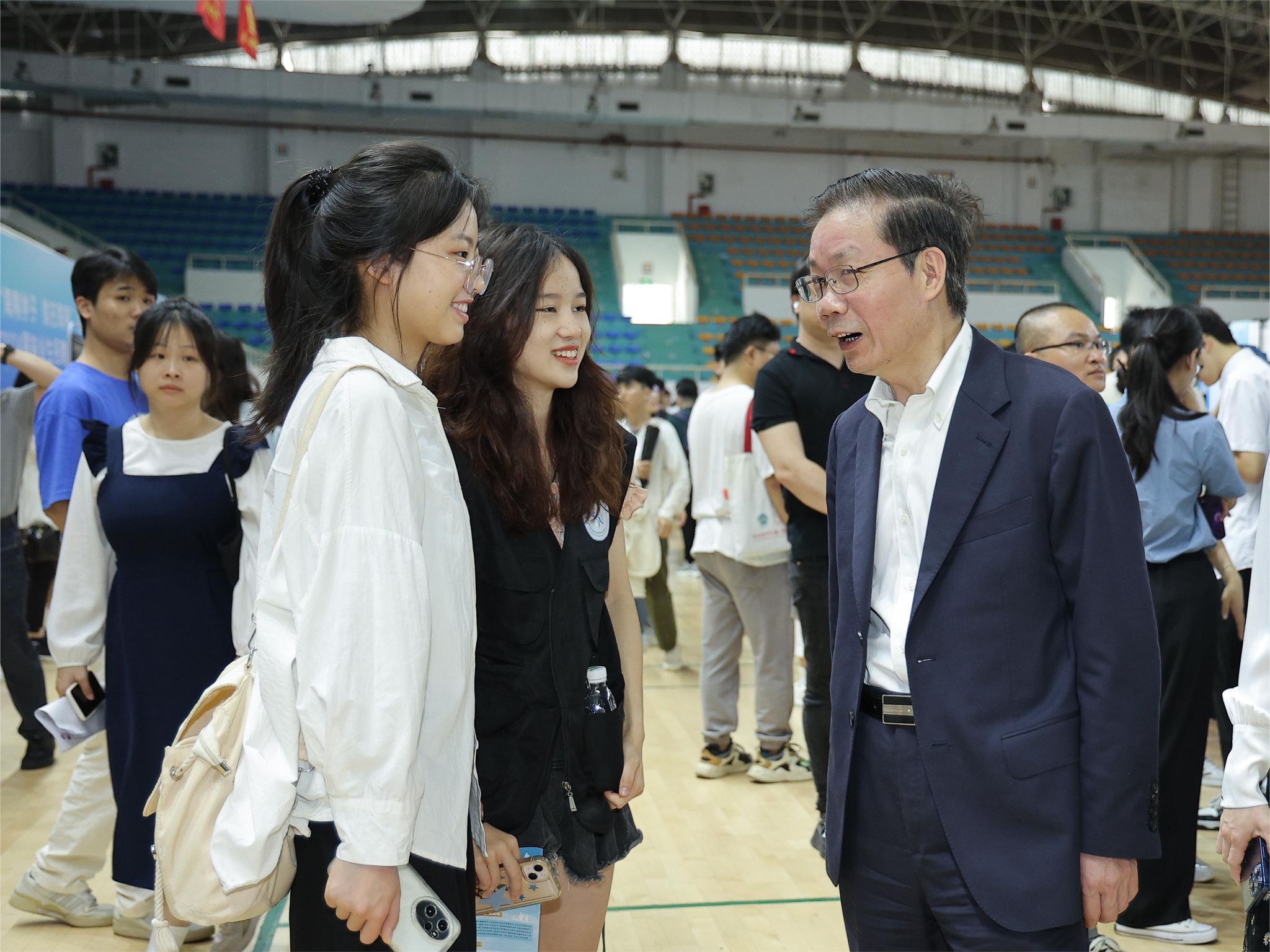 陈国强校长与现场的毕业生亲切交谈,仔细询问毕业生的专业、就业意向和求职进展,勉励他们找准定位、合理预期、增强信心,并鼓励他们留在海南,做海南自由贸易港的见证者、建设者、贡献者。
