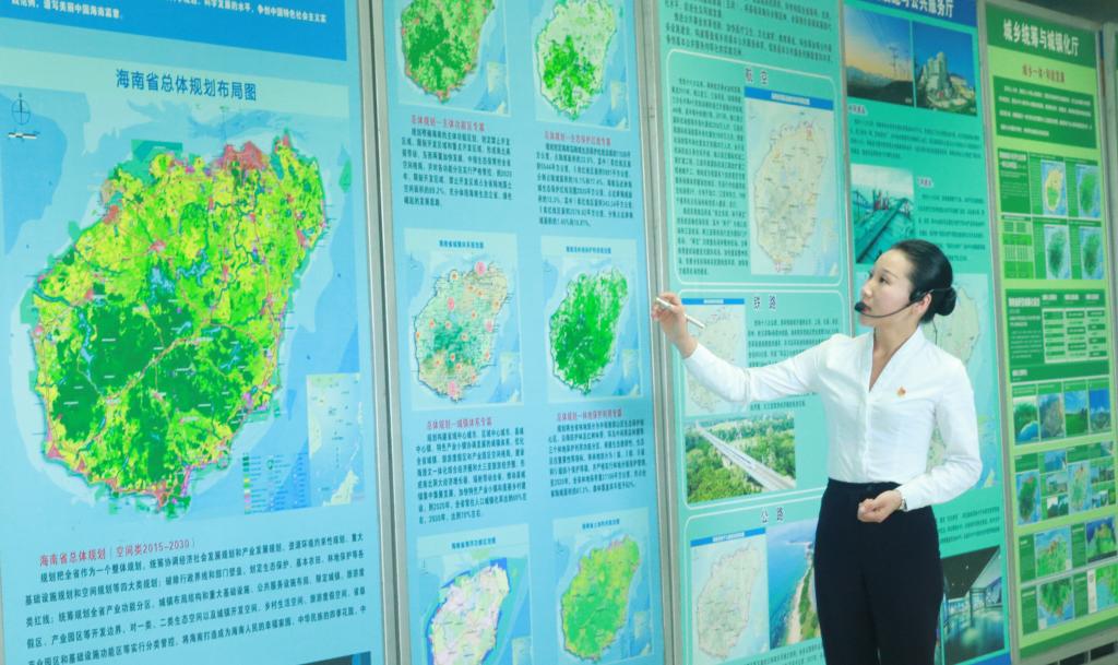 在以“多元融合 文脉传承”为主题历史足迹的展板上,可以清晰的看到海南省建设沿革,海洋发展,城镇变迁。从秦朝至今为海南作出贡献的历史人物,以及丝绸之路的重要航线,到有关海南省的城镇变迁充分展现了海南城镇建设进入蓬勃发展。在以“生态优势 立省之本”为主题生态资源厅展板上,从海南省概况,绿色宝库,蓝色宝藏,生态福地,旅游胜地,五个方面介绍了生态环境对海南省的重要作用。在以“先行先试 跨越发展”为主题的发展成就厅展板上,呈现海南省在综合实力,创新引领改革,对外开放,社会民生,党的建设方面取得了重大成就,迈上加快建设经济繁荣,使人民踏上幸福美好生活的新征程。在以“多规合一 整体布局”为主题的省多规合一的展板上,则从海南省主体功能区,生态保护,城镇体系,林地保护利用,海洋功能区划,土地利用六个方面介绍海南省的总体规划。在基础设施与公共服务,城镇统筹城镇规划展板上介绍全岛同城“设施共享 城乡一体”和谐发展的蓝图与成就。