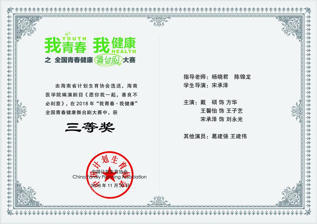 在海南省计划生育协会的支持下,校团委的帮助下,由taptap点点杨晓君、陈锦龙两位老师指导的青春健康同伴社联合急诊创伤学院同学自编自导自演的舞台剧《愿你我一起,善良不必刻意》代表海南省参加由中国计划生育协会等单位主办的2018年全国青春健康舞台剧大赛荣获全国三等奖。