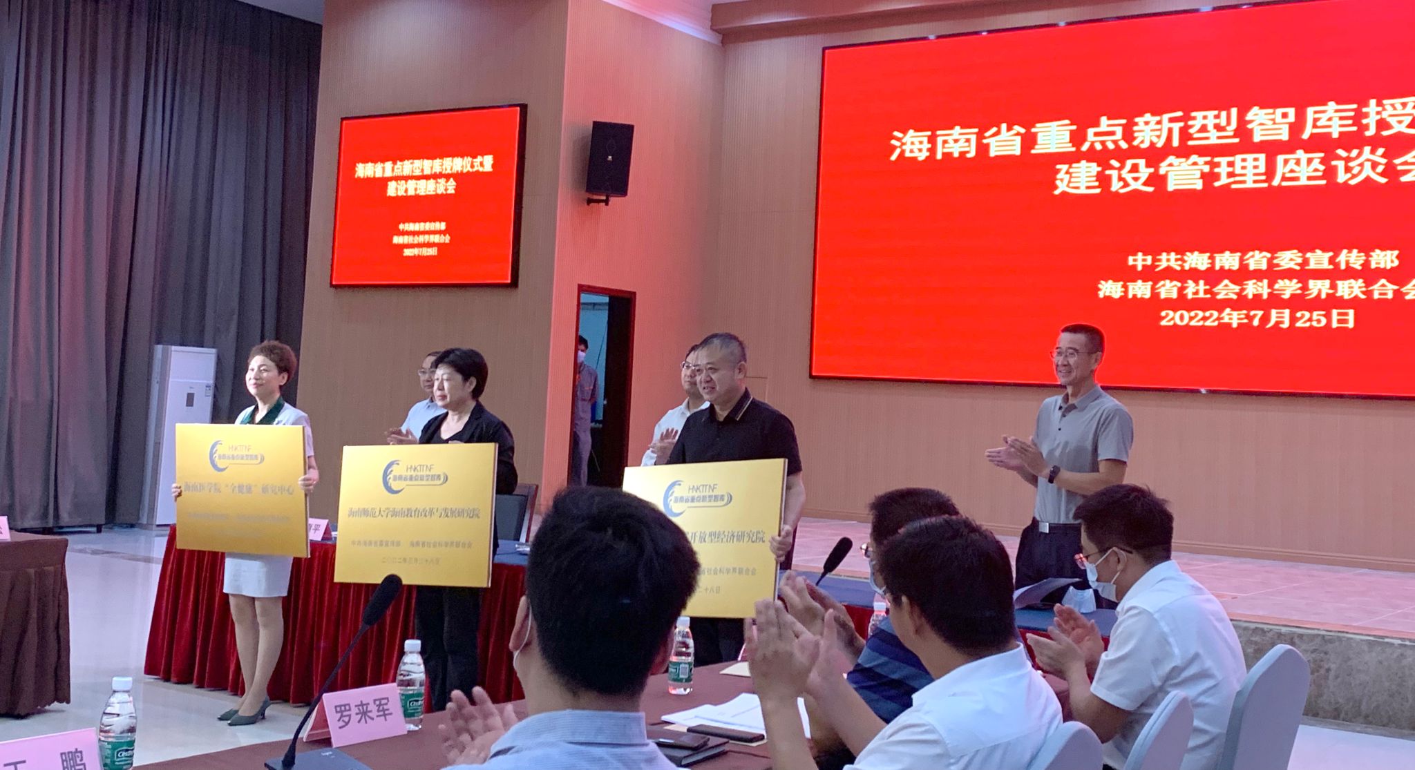 7月25日,在省委宣传部、省社科联举办的海南省重点新型智库授牌仪式暨建设管理座谈会上,以党委书记杨俊、陆家海、杨国静教授领衔申报的海南医学院全健康研究中心智库被授予海南省重点新型智库,该智库涵盖了学校公卫、热带医学、环境、管理学科专家。学校副校长张彩虹参加座谈会。