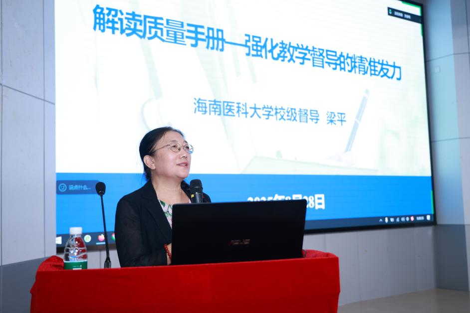 督导组组长涂蓉教授在专题报告中指出,审核评估指标中多项与督导工作直接相关,应重点关注毕业生目标达成度和满意度等短板,并通过清理“僵尸课程”、推动质量手册落地等措施提升督导精准度。副组长梁平教授系统解读了《本科教学质量手册》,从课程建设、大纲规范、实验安全到临床见习等方面进一步明确了督导标准,她强调:“督导不仅是监督,更重在指导,要以优质建议促进教学改进,构建和谐、协同的督导关系。”