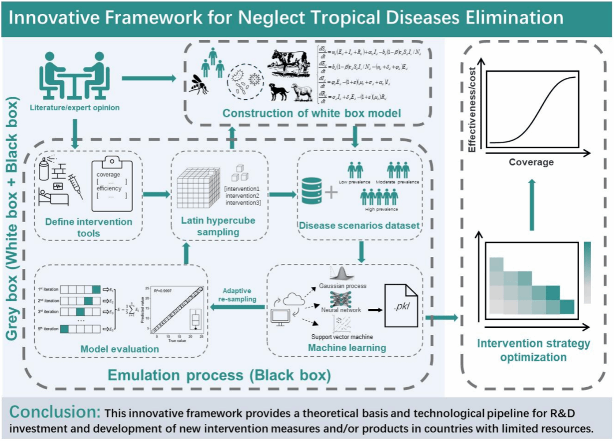 本研究提出了一种基于疾病传播动力学模型(Disease transmission dynamics model) (白盒)和机器学习(Machine Learning, ML)模型(黑盒)控制和消除被忽视的热带病(Neglected Tropical Diseases, NTDs)的新框架。研究通过探索混合建模方法在华支睾吸虫病干预策略优化中的应用价值,旨在揭示中国加强肝吸虫病防控过程中One Health理念各要素间的关联机制。该研究创新性地将传播动力学与机器学习相结合,并通过系统评估模拟指标与观测数据的差异性,这种融合方式在开展多场景大规模模拟及探索多种干预策略时具有显著优势。特别是在计算效率至关重要的应用场景中,该方法能快速评估不同干预措施或组合方案的潜在效果,从而实现资源分配的优化配置。