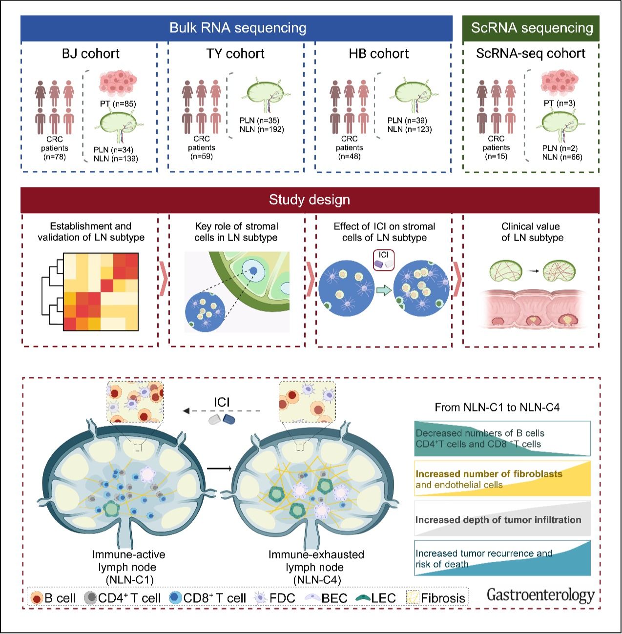 淋巴结作为关键的免疫器官,在肿瘤转移和免疫治疗等多个方面均发挥重要作用。尽管临床上已观察到淋巴结在形态和大小等特征上存在一定异质性,但此种异质性是否影响淋巴结的功能尚未见报道。本研究通过对200例结直肠癌患者的700余个淋巴结进行系统全面的基因表达分析,鉴定出四种功能各异的非转移性淋巴结亚型,并依据其免疫活性由强至弱分别命名为:免疫活跃型淋巴结、免疫损伤型淋巴结、免疫抑制型淋巴结和免疫耗竭型淋巴结。其中,免疫耗竭型淋巴结表现出与转移性淋巴结相似的高纤维化及低免疫功能特征。单细胞转录组分析进一步揭示,该类淋巴结中滤泡树突状细胞功能受到显著抑制,且其状态与疾病进展和患者生存密切相关。临床治疗数据表明,免疫治疗可在一定程度上逆转免疫耗竭型淋巴结的功能状态。本研究首次基于大规模人类样本证实了淋巴结存在功能异质性,为深入理解淋巴结在肿瘤转移及免疫治疗中的作用机制提供了新的研究方向。