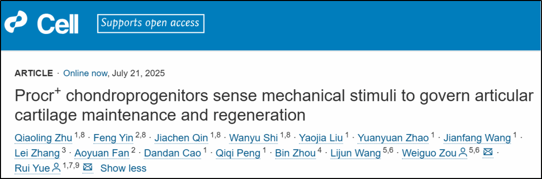 1. 邹卫国教授团队与岳锐教授合作发现Procr⁺软骨祖细胞通过感知机械力刺激调控关节软骨稳态与再生