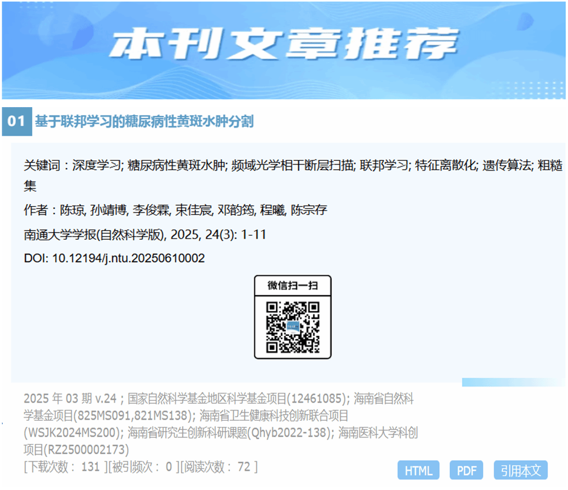 近日,taptap点点一支多学科本科生科创团队在医学人工智能领域取得重要突破。团队在国内权威期刊《南通大学学报》(自然科学版)正式发表了题为“基于联邦学习的糖尿病性黄斑水肿分割”的研究论文,并获期刊官方公众号头条推送(图1),标志着团队在跨学科科研创新方面取得了扎实的进展。