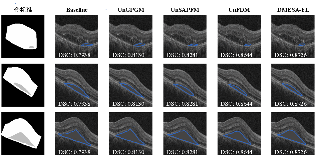 该研究聚焦糖尿病性黄斑水肿(DME)的精准诊断需求,创新性地提出一种基于联邦学习的SD-OCT影像分割算法——DMESA-FL(图2)。此算法通过为所有本地用户增加特征离散化预处理模块并在联邦学习中采用序列训练来高效安全地更新全局上下文金字塔融合网络,从而实现DME的精确分割(图3)。值得关注的是,团队成功将基于粗糙集的特征离散化模块嵌入序列联邦学习框架,在确保患者隐私安全的前提下,能够有效处理不同医疗机构之间的非独立同分布数据以提升模型的泛化能力,为AI在临床中的安全应用提供了新思路。