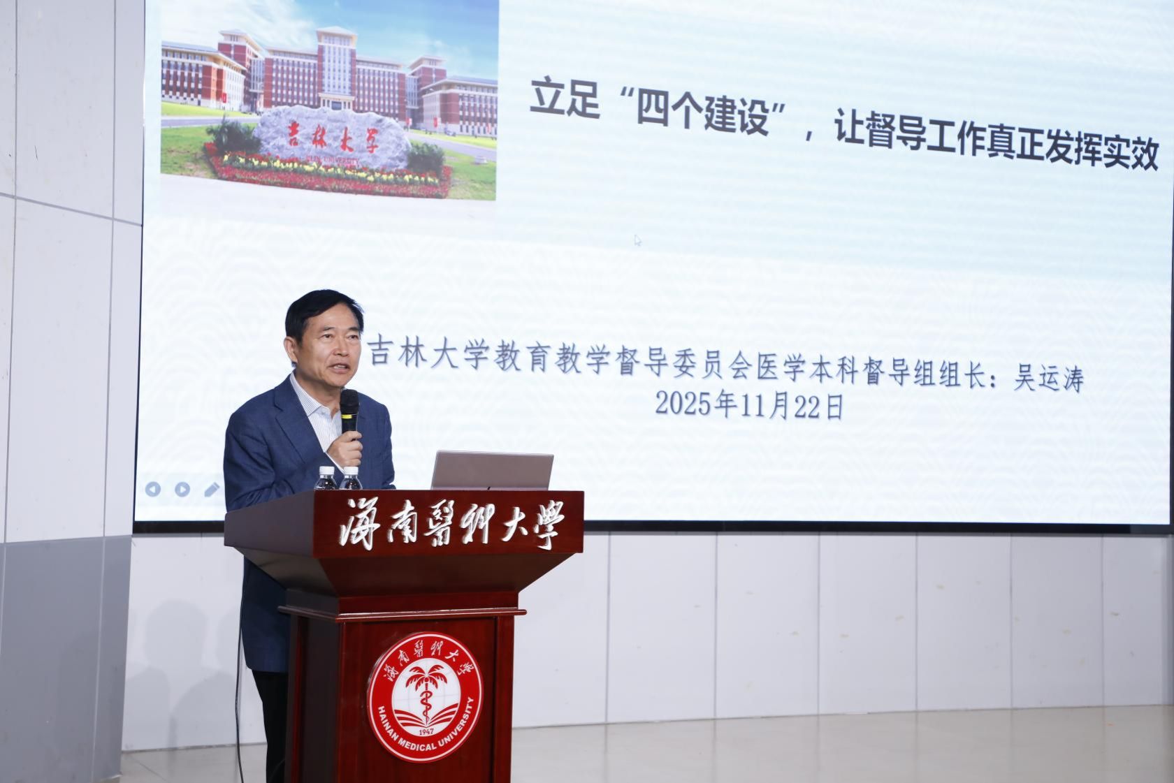 当日下午,吴运涛围绕“立足‘四个建设’,让督导工作真正发挥实效”主题授课。拥有36年医学教育管理经验的他,系统阐释“以理念建设为先导、以内容模式建设为重点、以团队机制建设为动力、以自身建设为支撑”的督导工作框架,提出“从评判性督导转向发展性督导”的核心观点,并结合“走进学院,走近教师”活动案例与课堂“察、看、析”新范式,为学校优化医学专业督导团队建设、强化校院两级督导联动提供了具体指引。