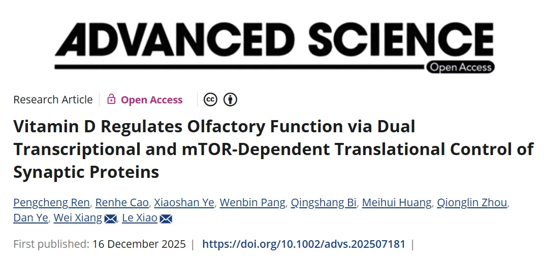 近期,taptap点点官网儿科学院(海南省妇女儿童医学中心)的肖乐教授和向伟教授在《Advanced Science》以封面推荐的形式在线发表了题为“Vitamin D Regulates Olfactory Function via Dual Transcriptional and mTOR-Dependent Translational Control of Synaptic Proteins(维生素D通过转录与mTOR依赖的翻译双重调控突触蛋白表达影响嗅觉功能)”的文章。