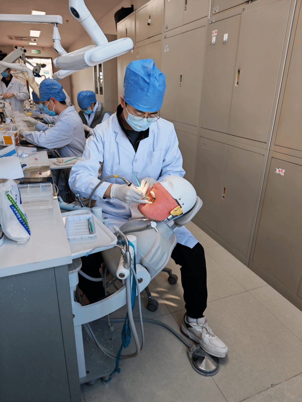 见面会结束后,同学们随即投入到北京大学口腔医学院紧张有序的临床训练中。图为联合培养博士生正在进行牙体临床前实习操作训练。
