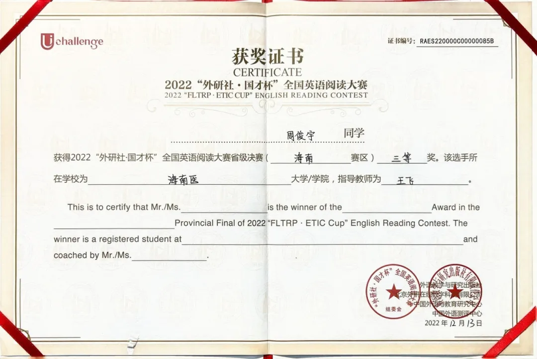 英语学习中,他不仅以高分通过四、六级考试,更获得“外研社·国才杯”全国英语阅读大赛省级铜奖,“努力提升外文学术文献阅读与写作能力,能帮助我直接追踪学科前沿,为未来科研提供更广阔的视角。”周俊宇自信而坚定。