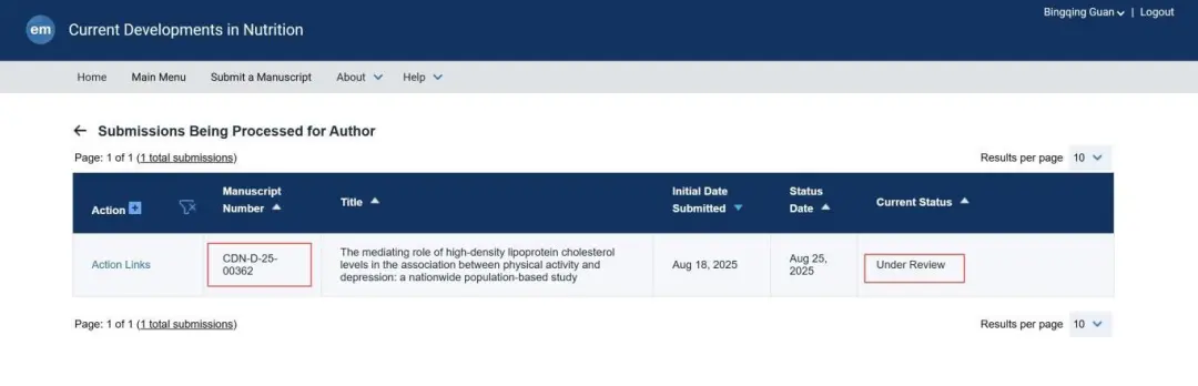 本科阶段,他独立完成《高密度脂蛋白胆固醇在体力活动与抑郁症关联中的中介作用:一项全国性人群研究》的科研项目,系统探讨身体活动与抑郁症之间的关联机制,并深入分析高密度脂蛋白胆固醇在其中的中介作用。该成果已以独立第一作者身份,投稿至JCR二区期刊Current Developments in Nutrition《营养学的最新发展》(影响因子:3.2)。