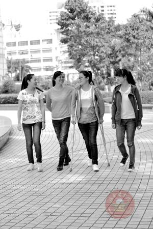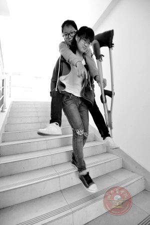 下课铃声响起。当大部分的学生都离开后,一名身穿红色上衣的女生双手拄着两根拐杖,吃力地从教室走出来,另外一名身穿绿色上衣的女生紧跟在她后面。
