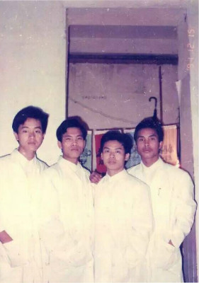 1991年,羊强(左一)怀着医生梦想在海南医学院第一次穿上白大褂