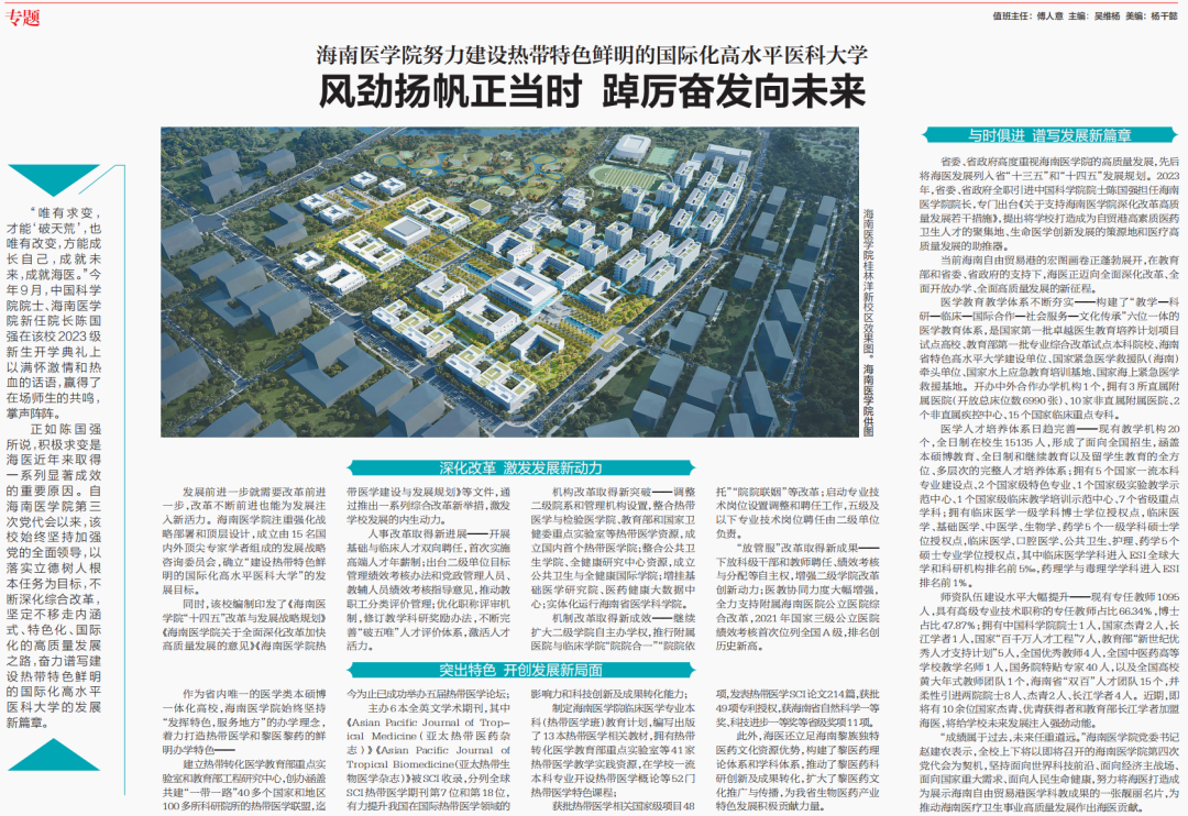 同时,该校编制印发了《海南医学院“十四五”改革与发展战略规划》《海南医学院关于全面深化改革加快高质量发展的意见》《海南医学院热带医学建设与发展规划》等文件,通过推出一系列综合改革新举措,激发学校发展的内生动力。