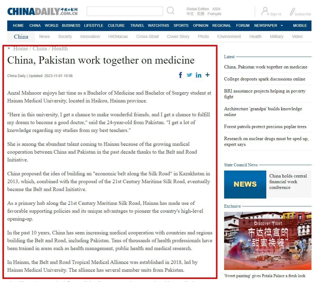 In the past 10 years, China has seen increasing medical cooperation with countries and regions building the Belt and Road, including Pakistan. Tens of thousands of health professionals have been trained in areas such as health management, public health and medical research.