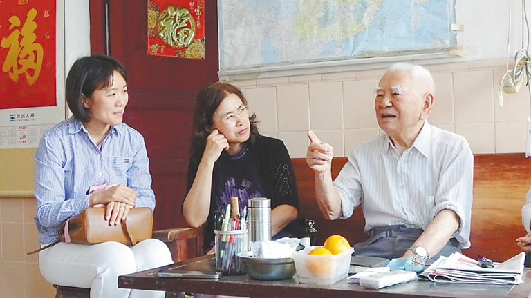 邓子夫(右)回忆研究孟氏裂头蚴病的经历。