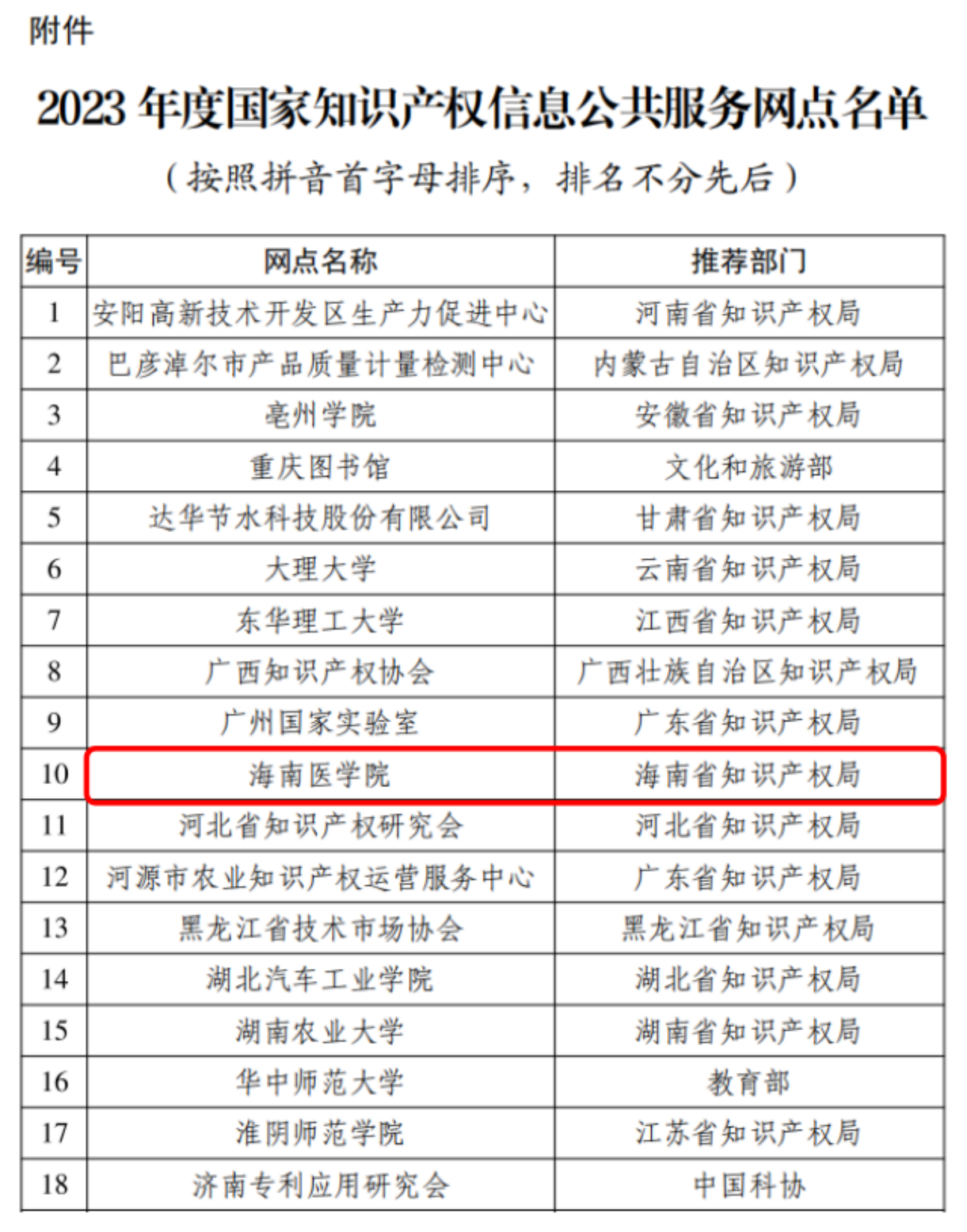 新海南客户端、南海网12月13日消息(记者 王洪旭)近日,国家知识产权局办公室印发通知,公布了41家2023年度国家知识产权信息公共服务网点名单。其中,海南医学院成功获批2023年度国家知识产权信息公共服务网点,是海南省唯一一家入选单位。
