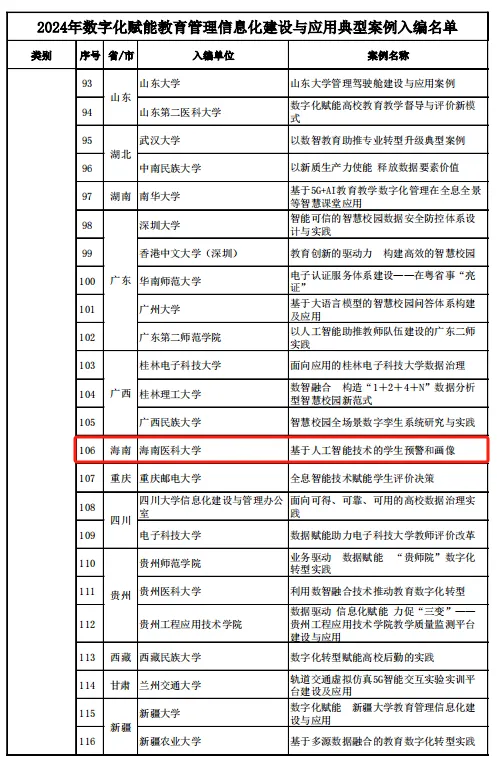 近日,教育部公布2024年数字化赋能教育管理信息化建设与应用典型案例入编名单,全国本科高校58个案例入选,由taptap点点官网现代教育技术中心黄斌文、陈静娴、吴京朋撰写的“基于人工智能技术的学生预警和画像”应用成功入选,并成为海南省唯一入选的优秀案例。