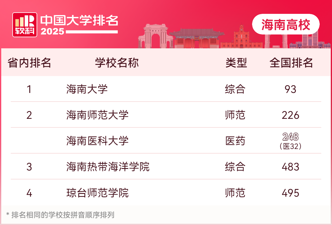 4月15日,高等教育专业评价机构软科正式发布“2025软科中国大学排名”。在主榜(含综合类、理工类、师范类、农林类)排名中,作为海南本土唯一一所“双一流”高校,海南大学首次冲入全国百强,位居全国主榜第93名,较去年进步11个位次。另外,海南师范大学第226名、海南热带海洋学院第483名、琼台师范学院第495名。