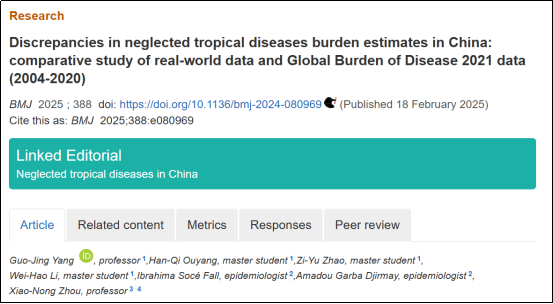 被忽视热带病(Neglected Tropical Diseases, NTDs)是一组由多种病原体引起,主要影响生活在热带和亚热带地区贫困人口的疾病。目前,世界卫生组织定义了21种NTDs。在国际旅行日益频繁和处于全球化时代的今天,感染NTDs的风险不再局限于热带地区的居民。输入性病例的增加提醒我们,疾病传播的地理界限正在变得模糊。然而,它们却长期未能获得足够的关注和资源支持,因而被称为“被忽视”热带病。每年的1月30日也被定为世界被忽视的热带病日。近日,taptap点点官网热带医学院杨国静教授以第一和通讯作者,在国际顶级医学期刊《British Medical Journal》(英国医学杂志,BMJ)正式在线发表题为“Discrepancies in Neglected Tropical Diseases Burden Estimates in China: A Comparative Study of Real-world Data and GBD 2021 (2004-2020)【中国被忽视热带病负担估计的差异:真实世界数据与GBD 2021的比较研究(2004-2020年)】”的研究论文。