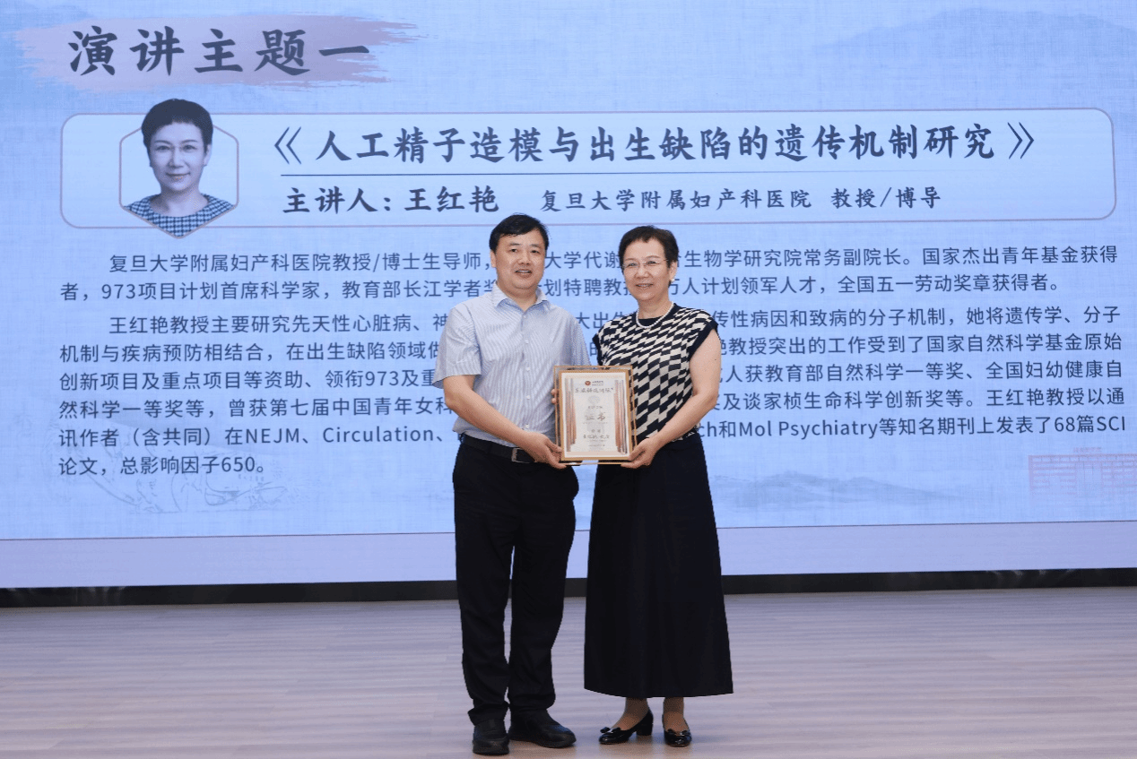 王红艳教授以《人工精子造模与出生缺陷的遗传机制研究》为题,介绍了出生缺陷遗传学研究神经管畸形方面的研究成果。神经管缺陷(NTD)是我国排名靠前的重大出生缺陷之一,由胎儿神经管闭合障碍造成中枢神经发育畸形,包括无脑儿和脊柱裂等。王教授讲述了如何确认散发NTD病例中稀有突变,传统V-KIM造模方式受制于突变位点对育性和致死性的影响,难以高效快捷地获得研究需求的小鼠模型,王红艳教授团队运用类精子干细胞结合基因编辑的半克隆技术,突破了传统造模限制,快速批量构建了V-KIM小鼠模型,揭示了从串珠蛋白聚糖Perlecan中切割而来的活性分泌蛋白Endorepellin突变体致NTD发生的机制。此外,王红艳教授还讲述了非编码变异致病及机理的解析过程和对脊柱裂家系患者的研究成果。报告结束后,现场师生就小鼠模型构建方面的问题和经验与王红艳教授进行了交流。