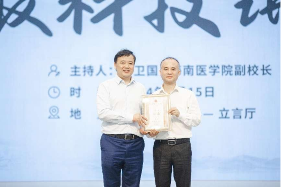 本期讲坛不仅展示了两位主讲专家在分子影响研究领域的最新研究成果,更为海南医学院师生提供了新的科研思路和方法。报告结束之际,邹校长为两位主讲专家颁发证书。