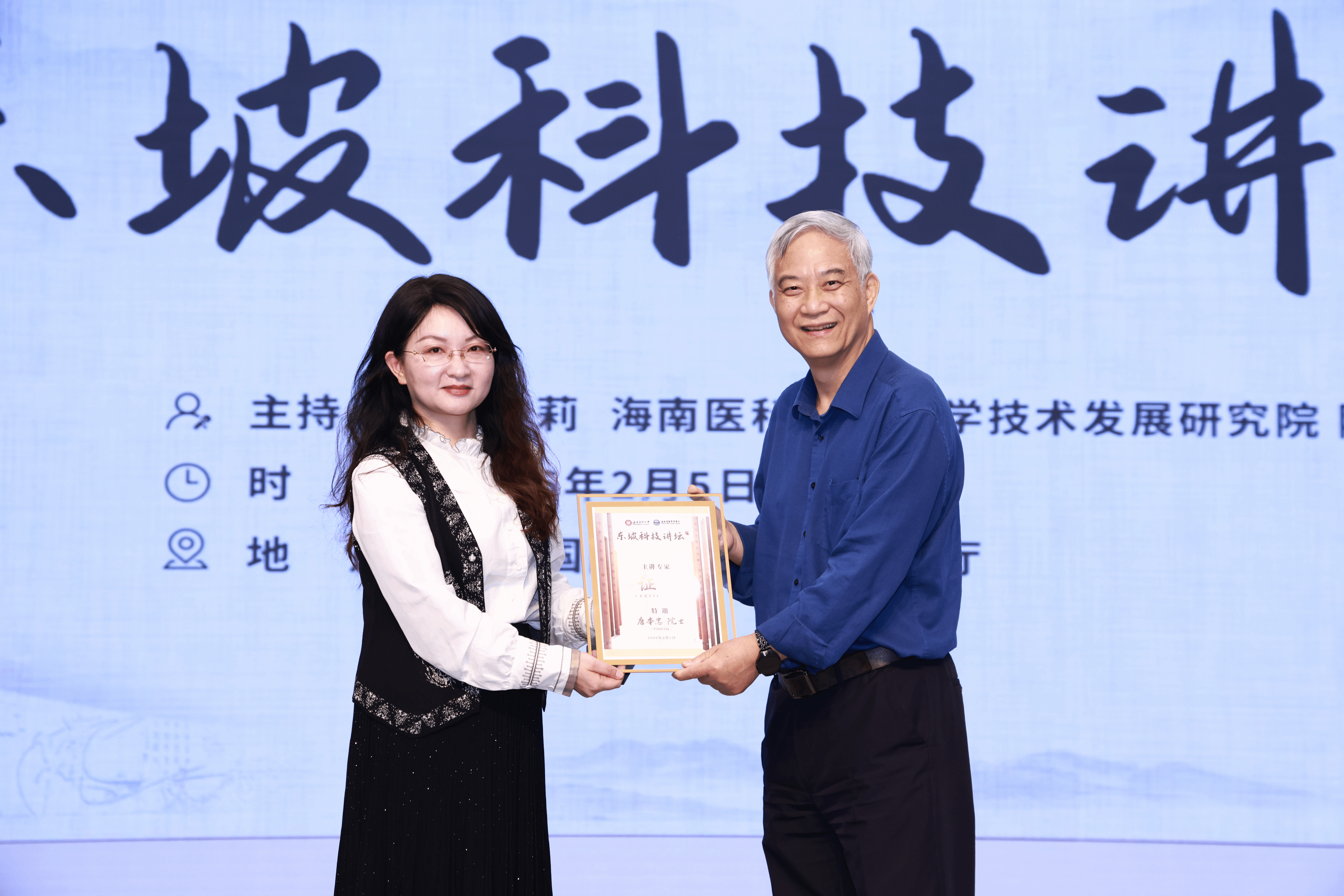在提问互动环节,现场多位化学、生物医学领域的研究者与唐院士展开专业问答,深入探讨了AIE分子亲疏水性调控、与功能蛋白的嫁接修饰等技术问题,同时就双方后续的合作可能进行了交流。报告最后,郭峻莉院长为唐本忠院士颁发讲坛纪念证书,本次东坡科技讲坛活动圆满结束。