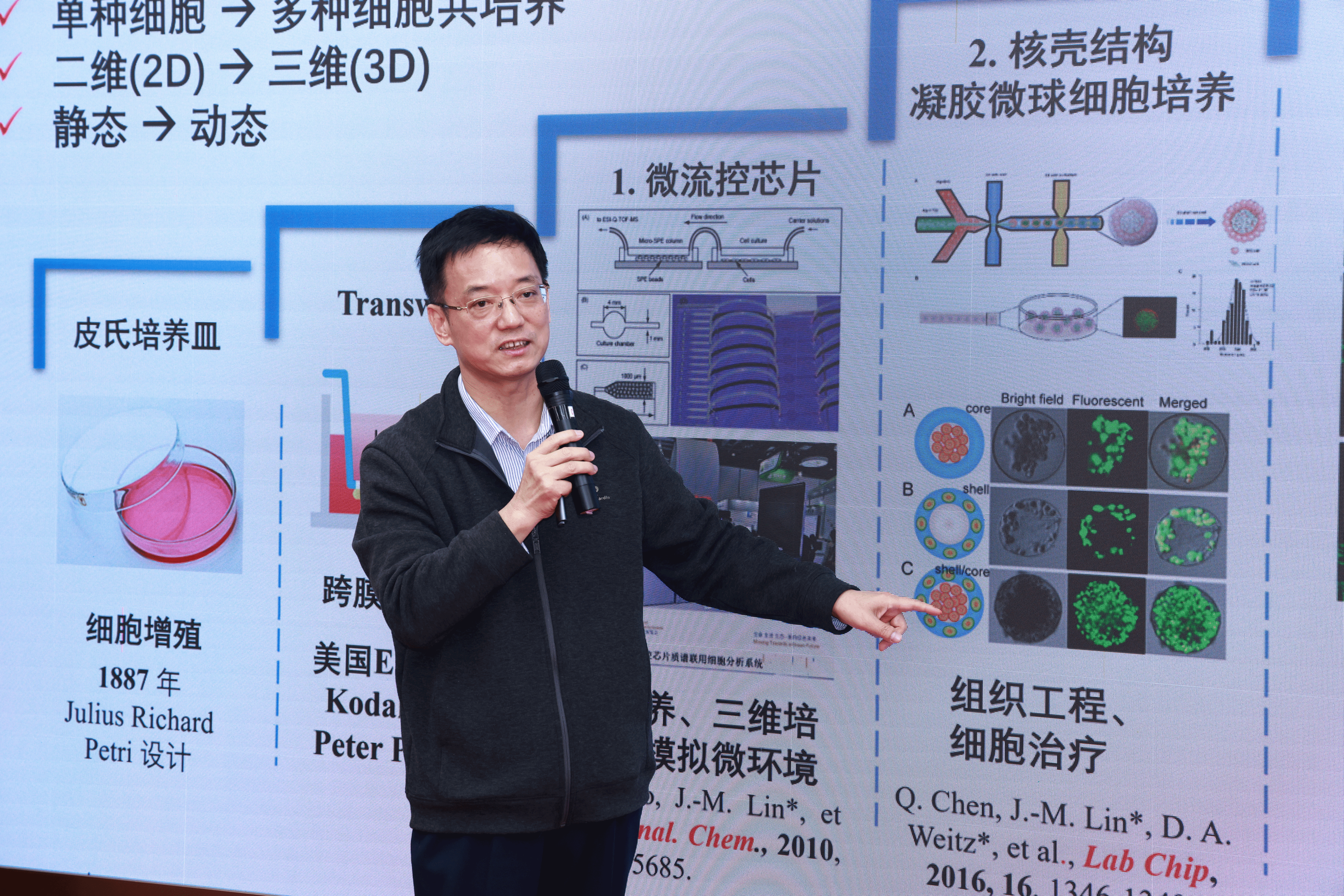 林金明教授以《微流控细胞培养及其在药物研究中的初步应用》为主题,聚焦微流控细胞培养技术的创新研发与药物研究实践应用展开分享。他详细介绍了微流控细胞培养技术从单种细胞培养到多种细胞共培养的技术演进历程,重点阐述了团队在多通道微流控培养芯片、凝胶微球制备仪器等核心技术与设备方面取得的创新成果。该技术可与色谱质谱、化学发光等检测手段深度融合,实现细胞动态培养与代谢产物在线分析,目前已成功应用于抗缺氧药物筛选、细胞与细菌相互作用研究、血脑屏障模拟等多个重要科研与应用场景。同时,林教授分享了技术转化、科研仪器推广及学生培养的实践经验,深刻凸显了科研技术落地应用的现实价值。