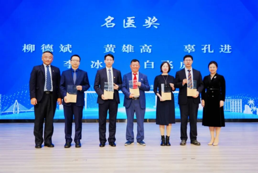 最后颁发的是名医奖。附属海南医院柳德斌,第一附属医院黄雄高、辜孔进,第二附属医院李冰、白飞虎等五位医师荣获该项荣誉。副校长曾敏与副总裁宋天骏共同为名医奖获得者颁奖,现场气氛庄重热烈。